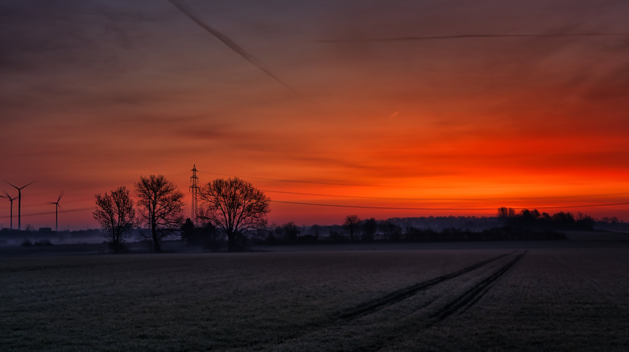 Ein Feld führt mit Fahrspuren zum Horizont. Der Himmel glüht in intensiven Rot- und Orangetönen.